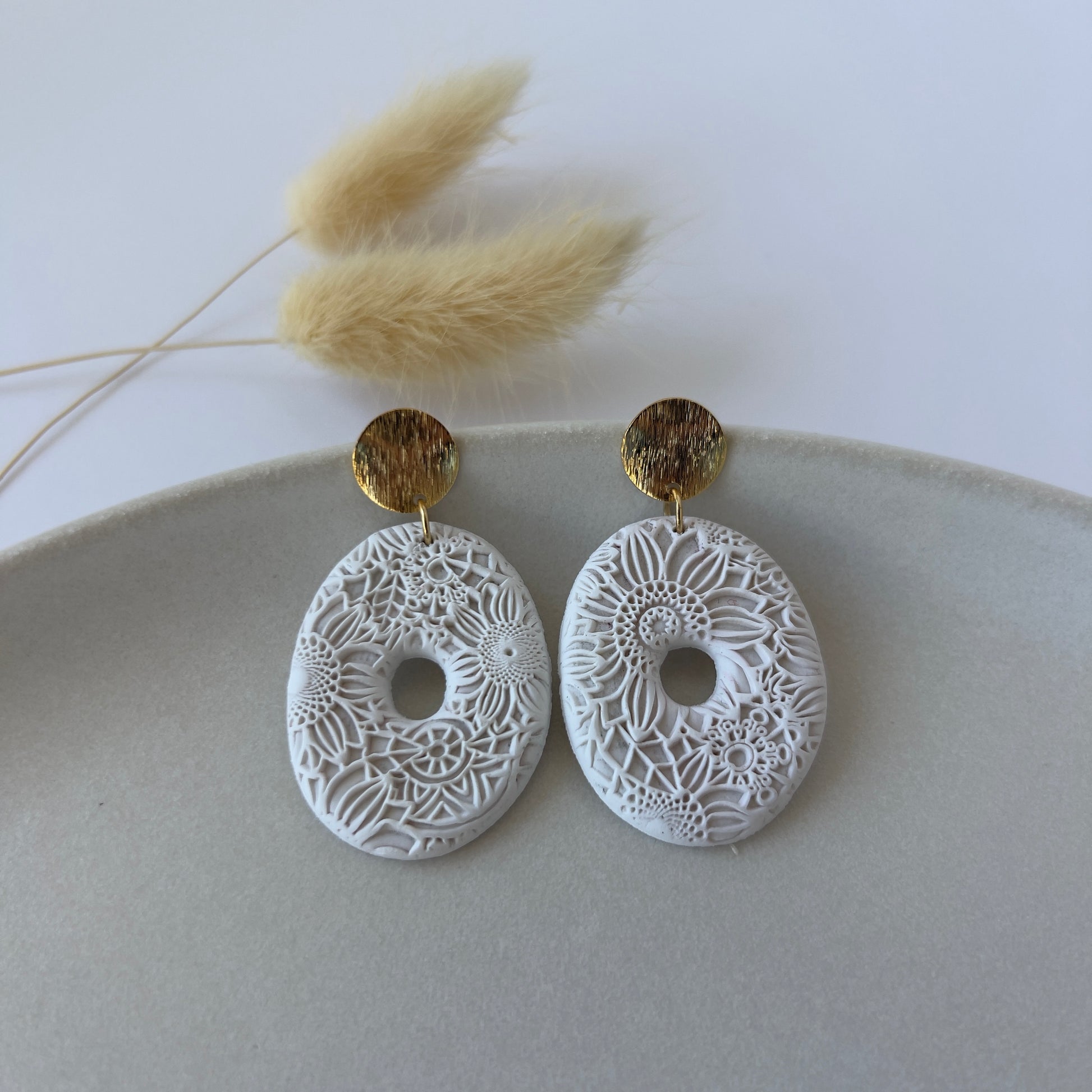 Pendientes hechos a mano con arcilla polimérica y acero inoxidable chapado en oro de grado quirúrgico hipoalergénico para orejas sensibles.
